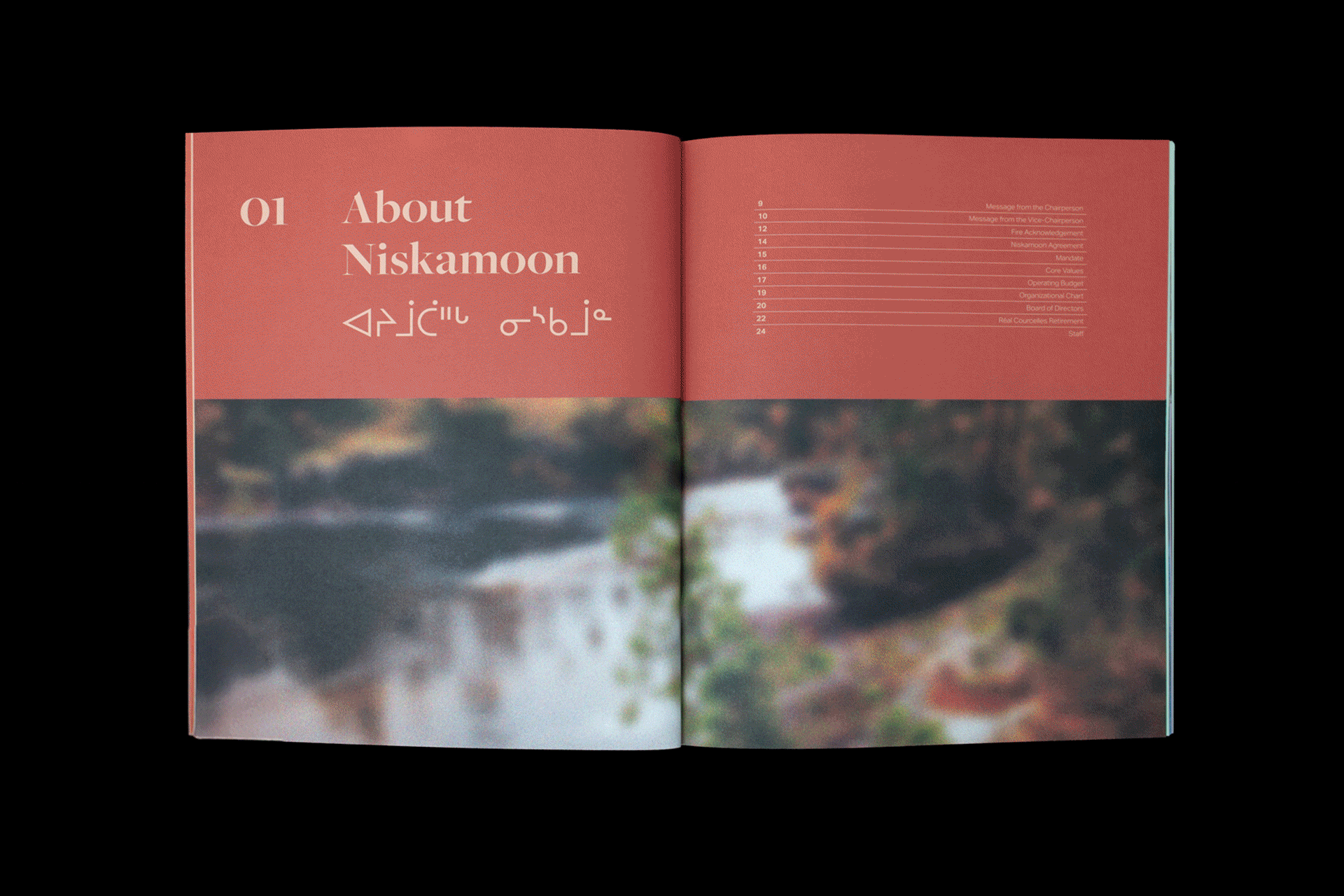 Photography takes center stage, capturing the beauty and resilience of the land throughout the year. Soft textures, subtle blurs, and gentle noise add depth and warmth, evoking the close connection between the Cree people and their environment. The annual report embodies Niskamoon Corporation’s mission, highlighting sustainability, resilience, and cultural continuity across Eeyou Istchee.
