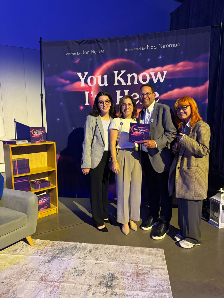 Un autre moment spécial de la soirée a été le lancement de You Know I’m Here, un magnifique livre pour enfants écrit par Jon Reider et illustré par Noa Ne’eman, publié par Garden Wolf Publishing House et conçu par votre serviteur. Le livre explore le thème de la perte à travers un prisme doux et imaginatif, ce qui en fait une ressource précieuse pour les familles en deuil. Pour célébrer son lancement, notre équipe a conçu un « coin lecture » confortable, évoquant la chaleur du foyer et les souvenirs qu'il renferme. Un éclairage tamisé, des textures inspirées des livres d'histoires et un choix judicieux de mobilier ont contribué à créer un coin intime où les invités pouvaient lire et acheter un exemplaire du livre pour un être cher.